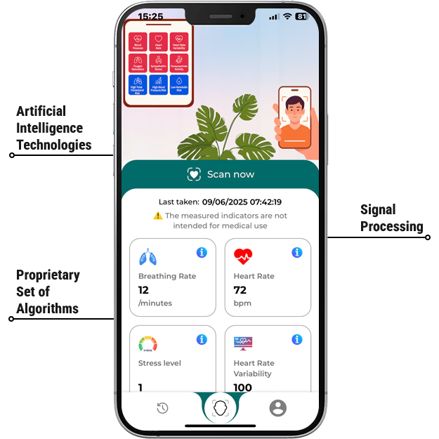 The processed signal is fed into JBAAI’s unique combinations of models and proprietary set of algorithms to process each vital sign or biomarker